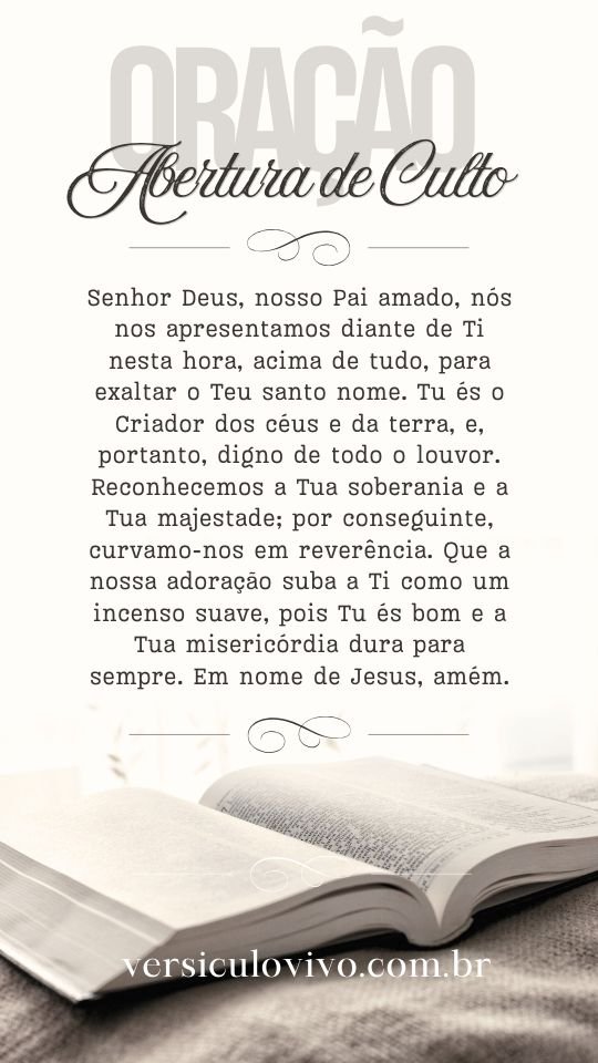 Senhor Deus, nosso Pai amado, nós nos apresentamos diante de Ti nesta hora, acima de tudo, para exaltar o Teu santo nome. Tu és o Criador dos céus e da terra, e, portanto, digno de todo o louvor. Reconhecemos a Tua soberania e a Tua majestade; por conseguinte, curvamo-nos em reverência. Podemos até meditar em um Salmo para abertura de culto para inspirar nossa adoração. Que o nosso clamor suba a Ti como um incenso suave, pois Tu és bom e a Tua misericórdia dura para sempre. Em nome de Jesus, amém.