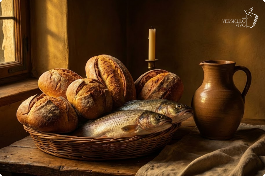 Em meio ao desespero, André encontra uma fagulha de recurso. É importante notar o que ele encontrou: pães de cevada (o pão dos pobres) e peixinhos (provavelmente pequenos peixes em conserva, como sardinhas). Era, de fato, um lanche infantil, totalmente inadequado para a situação. André, portanto, traz o recurso, mas sua fé ainda vacila, como vemos em sua pergunta subsequente.