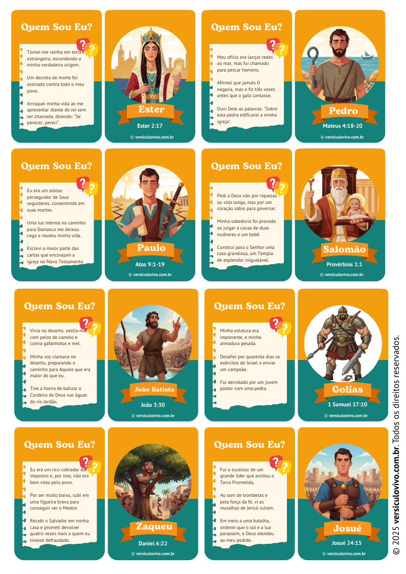 Para facilitar sua organização, você pode acessar listas prontas, como o jogo quem sou eu bíblico para imprimir. Ter isso em mãos economiza o tempo de ter que escrever nome por nome manualmente antes da reunião, além de garantir que a letra esteja legível para todos.