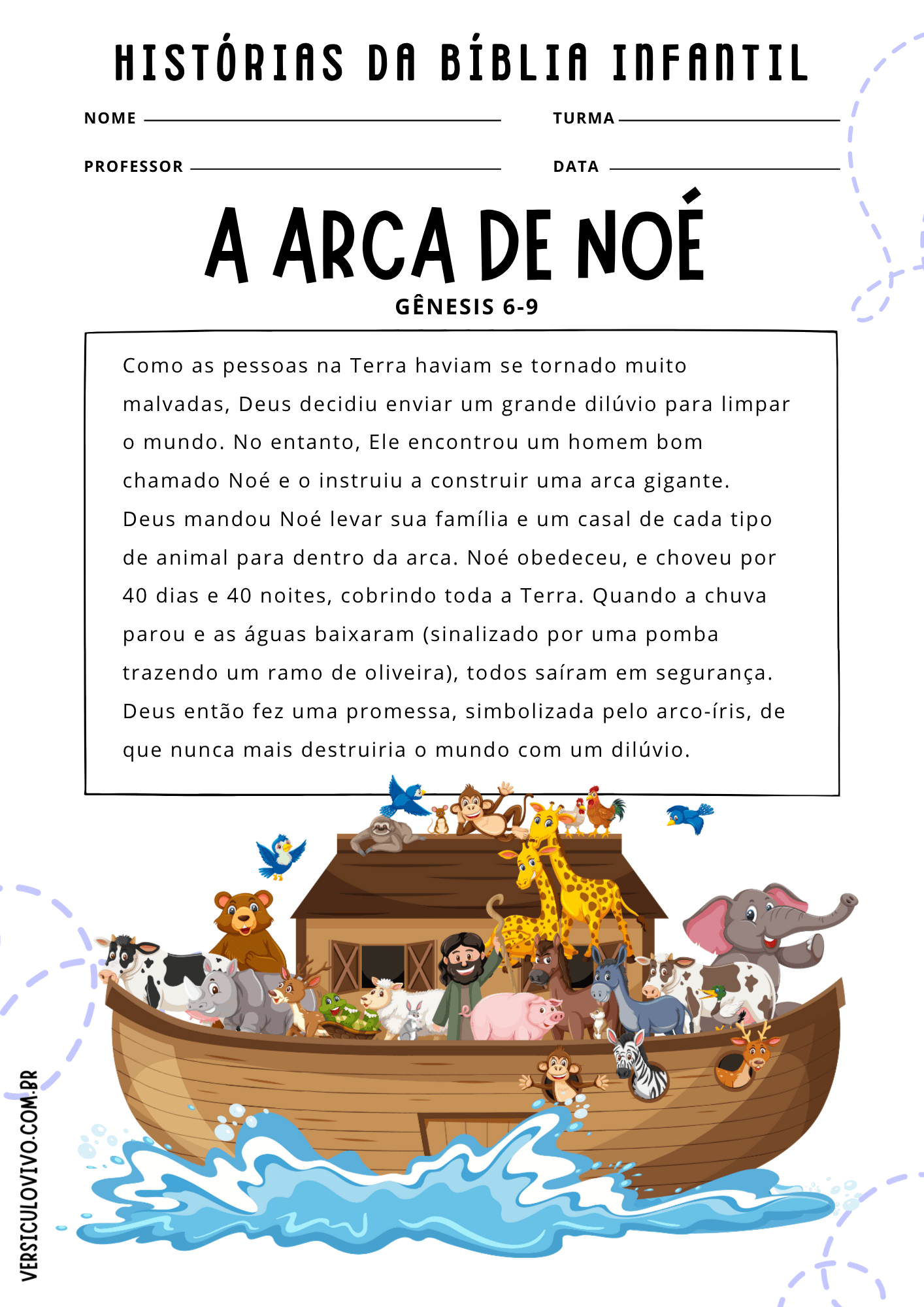 Depois de muito tempo, as pessoas na Terra ficaram muito malvadas. Deus olhou para o mundo e ficou muito triste. Mas havia um homem que ainda amava a Deus e era bom: o nome dele era Noé.