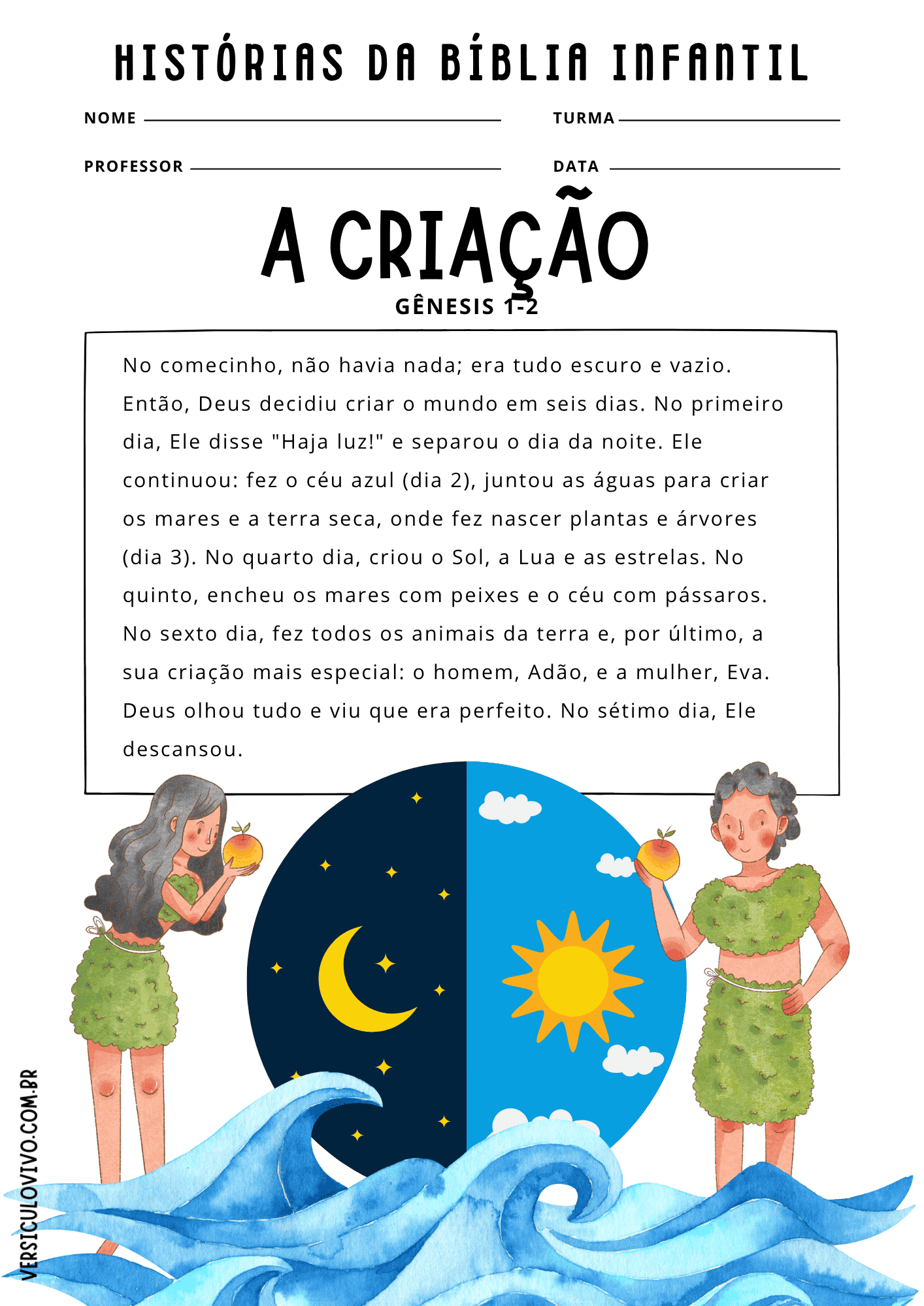 Quando Deus viu tudo o que tinha feito, Ele sorriu e disse: ‘Ficou tudo perfeito!’ No sétimo dia, Deus descansou e abençoou esse dia.