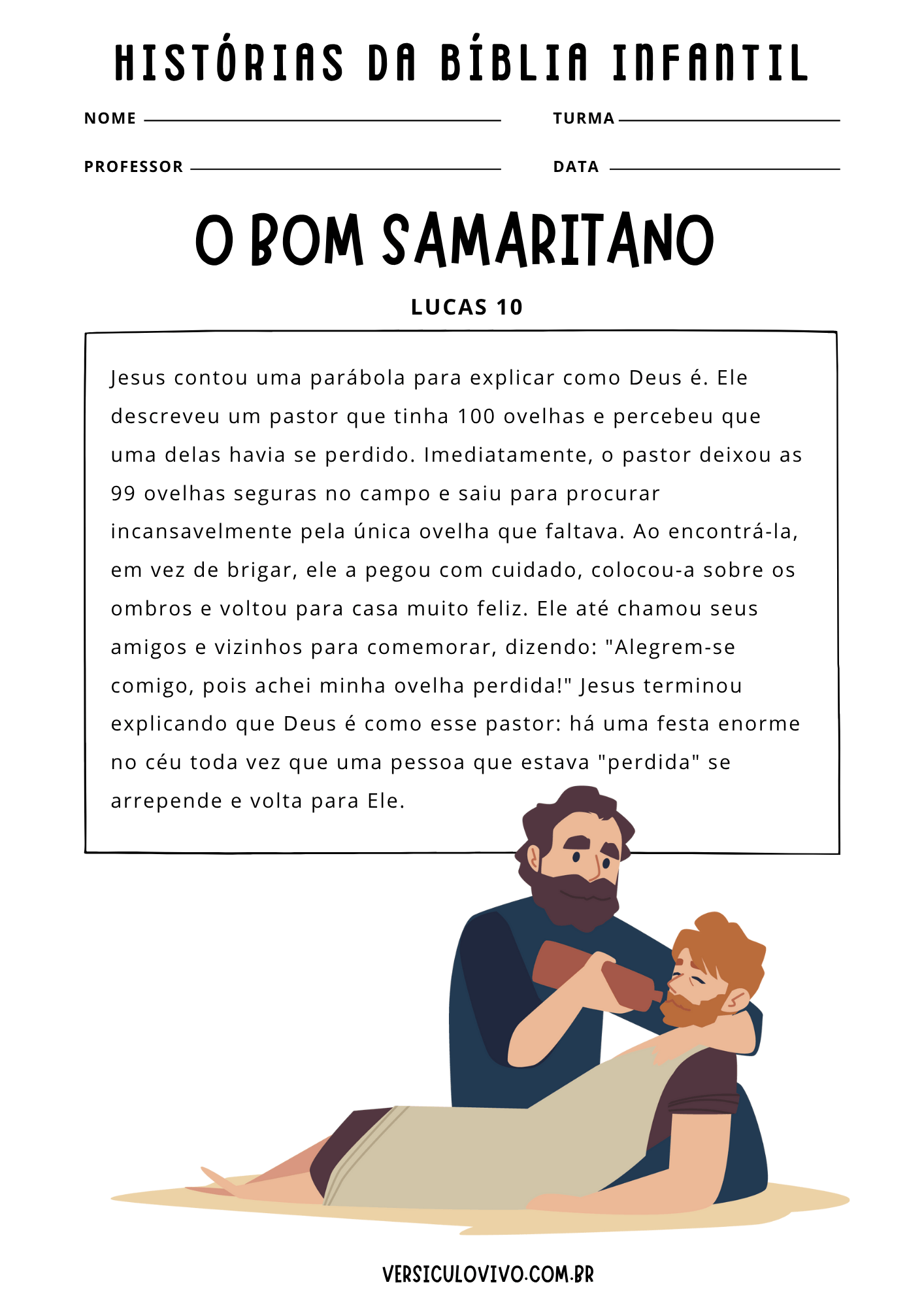 ‘Por último, veio vindo um homem de Samaria, um samaritano. (Naquela época, judeus e samaritanos se odiavam!). Quando o samaritano viu o homem, ele não foi embora. Ele sentiu muita dó.’