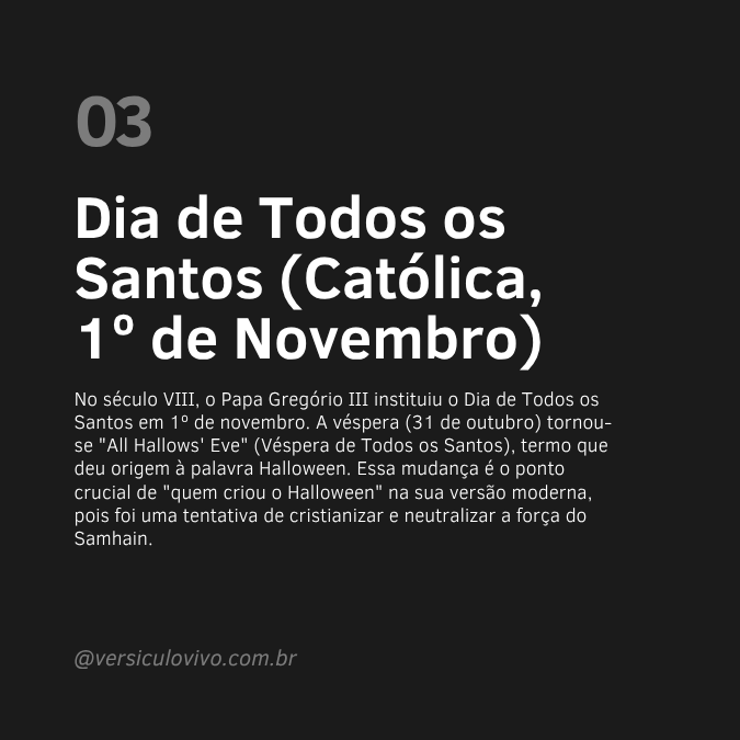 - Dia de Todos os Santos (Católica, 1º de Novembro): No século VIII, o Papa Gregório III instituiu o Dia de Todos os Santos em 1º de novembro. A véspera (31 de outubro) tornou-se “All Hallows’ Eve” (Véspera de Todos os Santos), termo que deu origem à palavra Halloween. Essa mudança é o ponto crucial de “quem criou o Halloween” na sua versão moderna, pois foi uma tentativa de cristianizar e neutralizar a força do Samhain.