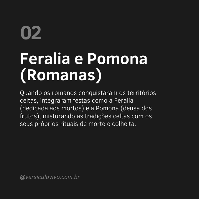 - Feralia e Pomona (Romanas): Quando os romanos conquistaram os territórios celtas, integraram festas como a Feralia (dedicada aos mortos) e a Pomona (deusa dos frutos), misturando as tradições celtas com os seus próprios rituais de morte e colheita.