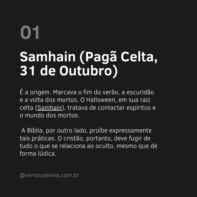Reflexão: O cristão tem o dever de escolher o que celebrar. Em vez de se conformar com uma festa cuja raiz exalta a morte e o medo, ele tem a liberdade de celebrar o Deus que deu a vitória sobre a morte. Essa é a essência do princípio da separação.