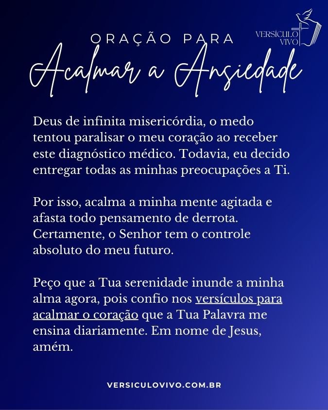 Deus de infinita misericórdia, o medo tentou paralisar o meu coração ao receber este diagnóstico médico. Todavia, eu decido entregar todas as minhas preocupações a Ti. Por isso, acalma a minha mente agitada e afasta todo pensamento de derrota. Certamente, o Senhor tem o controle absoluto do meu futuro. Portanto, peço que a Tua serenidade inunde a minha alma agora, pois confio nos versículos para acalmar o coração que a Tua Palavra me ensina diariamente. Em nome de Jesus, amém.