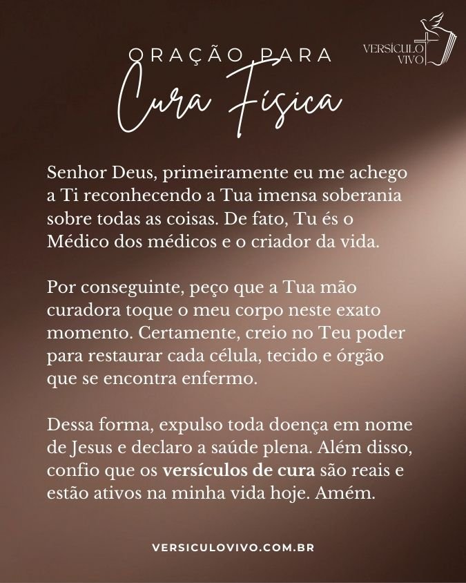 Senhor Deus, primeiramente eu me achego a Ti reconhecendo a Tua imensa soberania sobre todas as coisas. De fato, Tu és o Médico dos médicos e o criador da vida. Por conseguinte, peço que a Tua mão curadora toque o meu corpo neste exato momento. Certamente, creio no Teu poder para restaurar cada célula, tecido e órgão que se encontra enfermo. Dessa forma, expulso toda doença em nome de Jesus e declaro a saúde plena. Além disso, confio que os versículos de cura são reais e estão ativos na minha vida hoje. Amém.