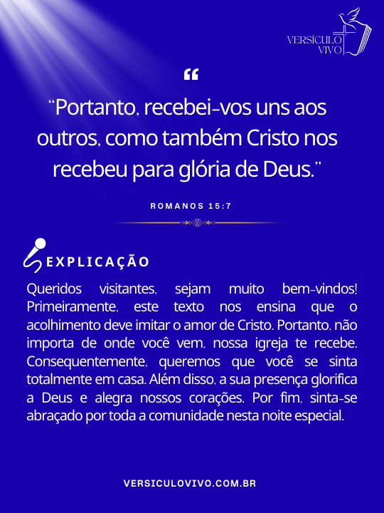 Queridos visitantes, sejam muito bem-vindos! Primeiramente, este texto nos ensina que o acolhimento deve imitar o amor de Cristo. Portanto, não importa de onde você vem, nossa igreja te recebe. Consequentemente, queremos que você se sinta totalmente em casa. Além disso, a sua presença glorifica a Deus e alegra nossos corações. Por fim, sinta-se abraçado por toda a comunidade nesta noite especial.