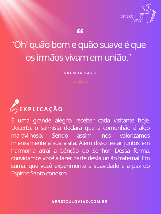 Visitantes queridos, este é o desejo do nosso coração. Se você precisa de uma palavra de saudação para culto de jovens, este versículo inspira comunhão. Além disso, queremos que você encontre aqui um lar espiritual seguro e constante. Portanto, que a beleza do Senhor atraia você a voltar mais vezes. Em resumo, nossa igreja está de portas abertas para recebê-lo com imenso amor.